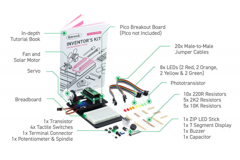 The Kitronik Inventor's Kit for the Raspberry Pi Pico offers the perfect introduction to physical computing with the Pico. This Inventor's Kit contains everything you need to complete 10 exciting experiments and the included booklet walks you through every step of each.