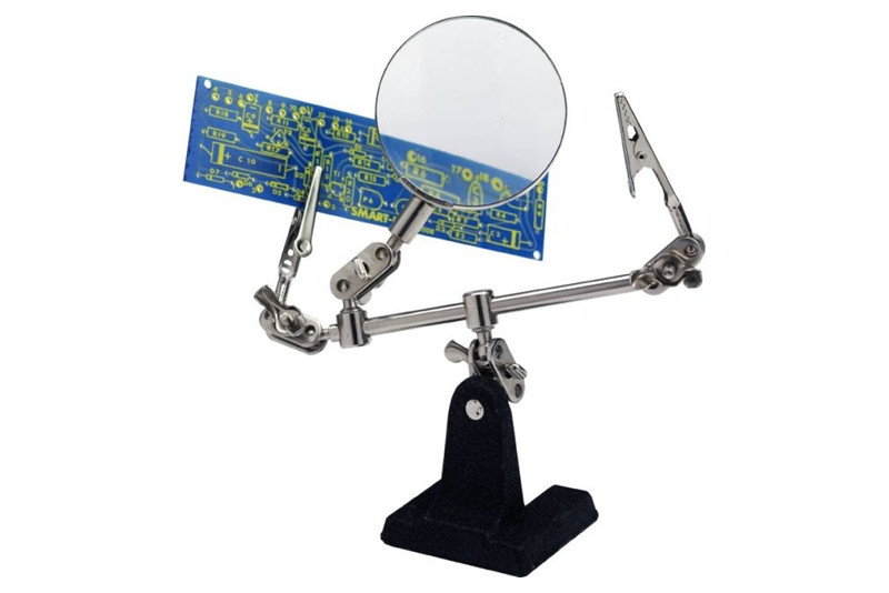 Donau HH2 helping hand with magnifying glass is a versatile soldering and PCB holder equipped with a 4x magnification lens. The device offers extensive adjustment options thanks to ball joints and crocodile clips, making precise work easier.