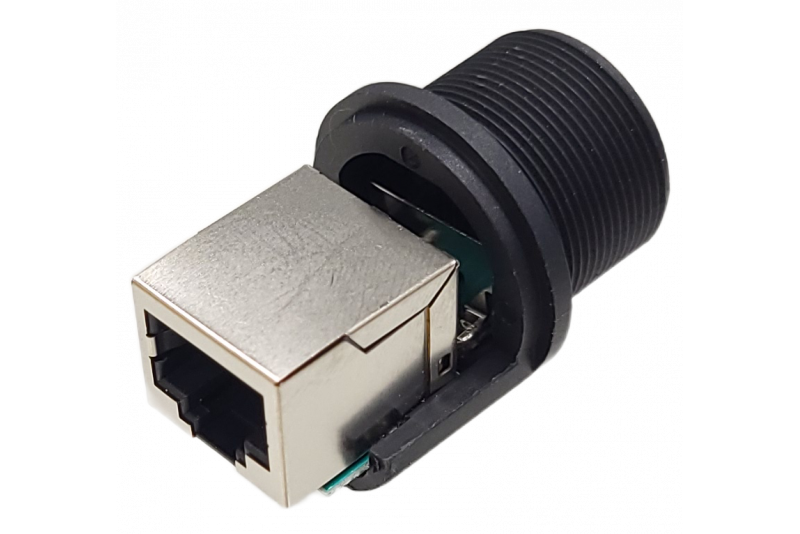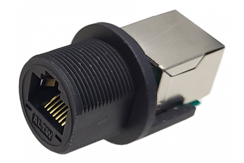 - Connector Type: Cat5e, 8P8C (RJ‑45 jack-to-jack coupler) with screw-thread circular / bayonet coupling