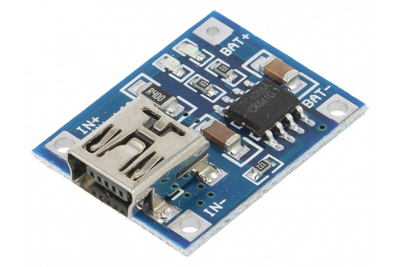 Toiminta perustuu laturipiiriin TP4056A. Virtalähteenä voi käyttää soveltuvaa yleistä miniUSB-liittimellä varustettua seinälaturia. Punainen ledi kertoo latauksesta, vihreä lataus valmis.
