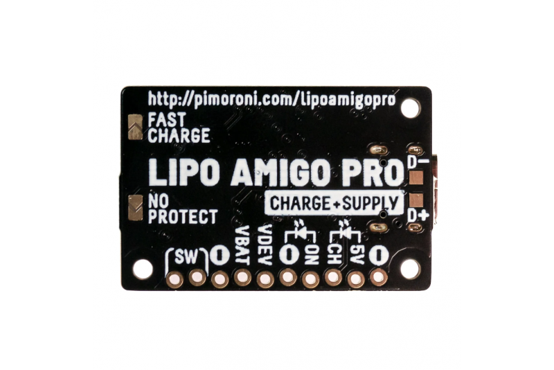 LiPo Amigo Pro on hieman suurempi ja siinä on joitakin lisäominaisuuksia. Siinä on kaksi JST-PH liitintä, joten voit ladata akkusi ja käyttää laitetta samanaikaisesti (ja vaihtaa saumattomasti USB- ja akkuvirran välillä). Siinä on myös virtapainike ja ylimääräinen sisäänrakennettu akun suojaus.