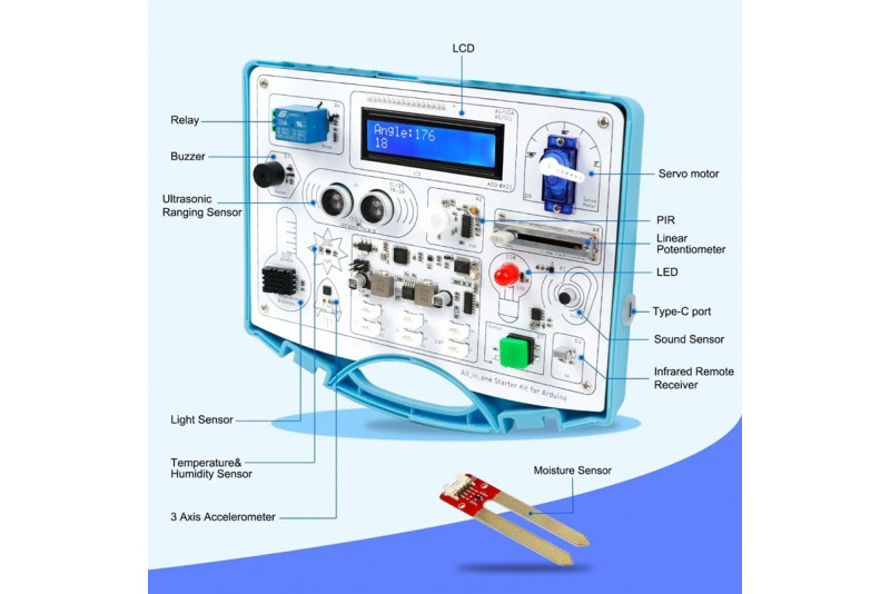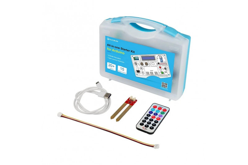Elecrow SEA0004T - All-in-one Starter Common Board Kit for Arduino on kattava aloituspaketti elektroniikan ja ohjelmoinnin opiskeluun. Paketti sisältää 15 sensoria ja yli 20 vaiheittaista opasta, joiden avulla opit Arduino-perusteet helposti ja hauskasti ilman juottamista.