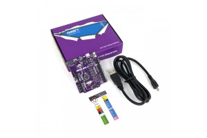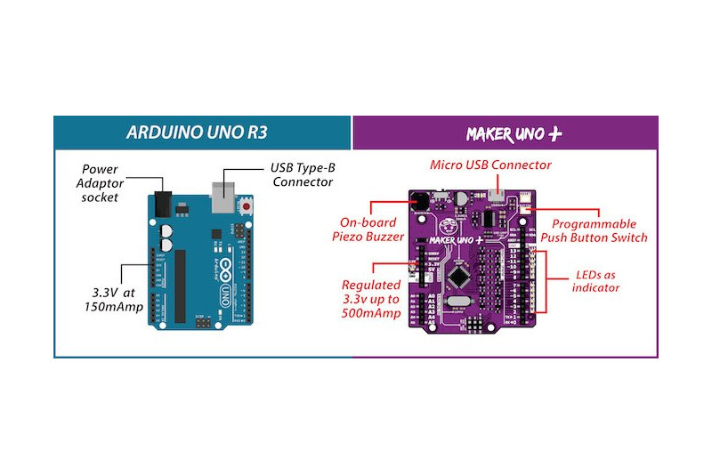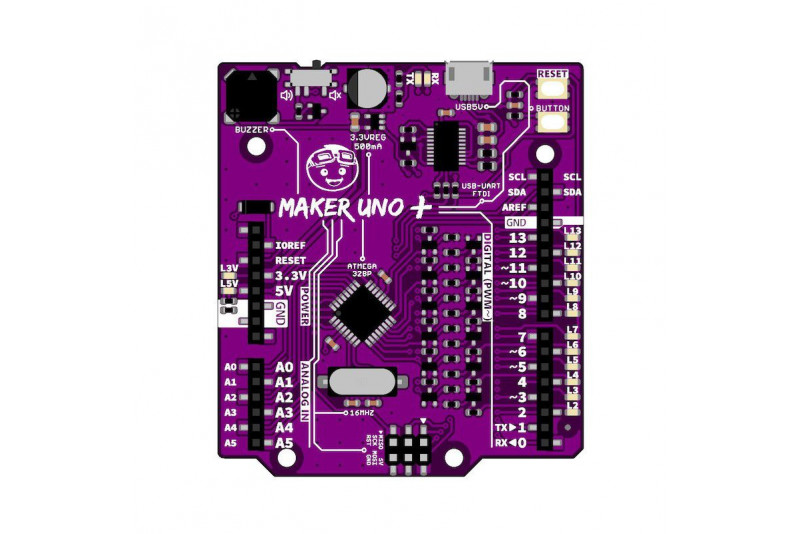 Maker UNO Plus is fully compatible with Arduino. You can share the same library and code. Compared with the original Arduino Uno, Maker UNO Plus has added with 12x LED, 1x piezo buzzer and 1x programmable pushbutton switch. The current of 3.3V is boosted to 500mA from 150mA to support more 3.3V's devices. The DC jack power input socket is removed and the conventional USB Type B is also replaced with the more commonly used USB Micro B.