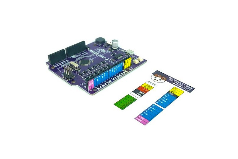 One of the brilliant features of the official Arduino Uno is the label printed on its pin headers. It saves us a lot of time when we want to connect the I/O pins to the external circuit. So, we include a set of these label stickers for pin headers in each of the Maker UNO Plus! (Please note that you need to peel off the stickers and stick them on the board by yourself)