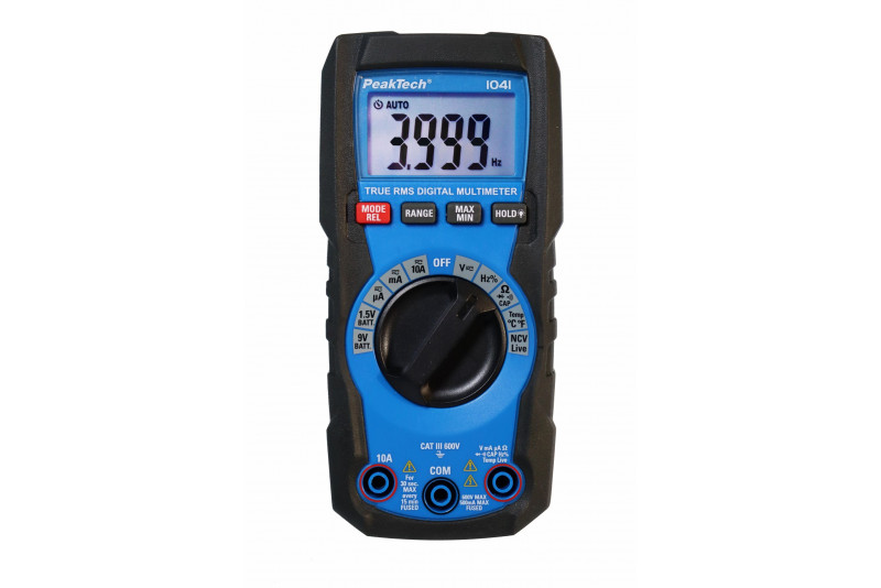 Uusi PeakTech 1041 on kompakti TrueRMS-monitoimimittari kestävässä kotelossa. Tämä uutuus tarjoaa kaikki tärkeät mittausominaisuudet, kuten suora ja vaihtojännitemittaus jopa 600 V asti, suora ja vaihtovirtamittaus jopa 10 A asti, resistanssimittaus, jatkuvuuden testaus ja dioditestaus sekä käytännöllinen paristojen testaus 9 V tai 1,5 V paristoille. Lisäksi tämä malli tarjoaa taajuusmittauksen, kapasitanssimittauksen ja koskettamattoman jännitteenilmaisimen. Mittausalue valitaan automaattisesti tällä laitteella, mikä takaa erityisen helpon käytön, ja mitatut arvot voidaan helposti lukea valaistulta näytöltä. Yksipuoliset vaihetestit voidaan suorittaa LIVE-toiminnolla. Käyttäjän turvallisuus varmistetaan ylikuormituskategoriassa III jopa 600 V asti ja kaksoiseristetyllä kotelolla, jolloin paristot ja laadukkaat keramiikkasulakkeet ovat nopeasti vaihdettavissa laitteen takaosassa sijaitsevan paristotilan kautta.