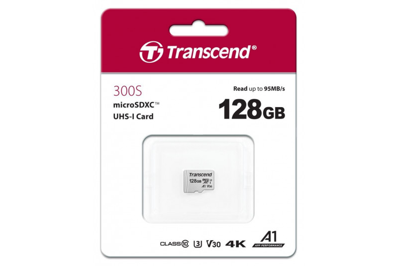 Transcend TS128GUSD300S - microSDXC 128GB, U3 V30 A1 (R100 W40 MB/s). Raspberry Pi käyttöön hyväksi todettu muistikortti.