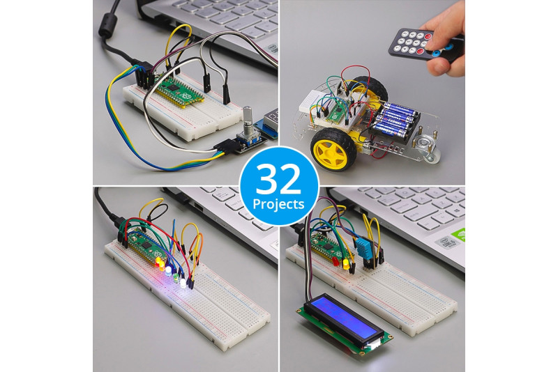 Raspberry Pi Pico Advanced Kit sisältää viralliseen RP2040-siruun perustuvan Pi Picon, 32 anturimoduulia, 1 älyautosarjan ja 32 Raspberry Pi Pico -projektia. Tämän kitin avulla voit toteuttaa useita mielenkiintoisia ja käytännöllisiä projekteja.