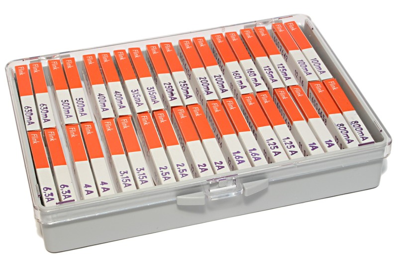 Jokaista arvoa löytyy kaksi punaisella merkittyä rasiaa. Yhteensä 360 kpl 5x20mm 250VAC lasiputkisulakkeita. Nopeusluokka nopea (= fast F). Malliperhe Eska 522 (EN60127-2-2).